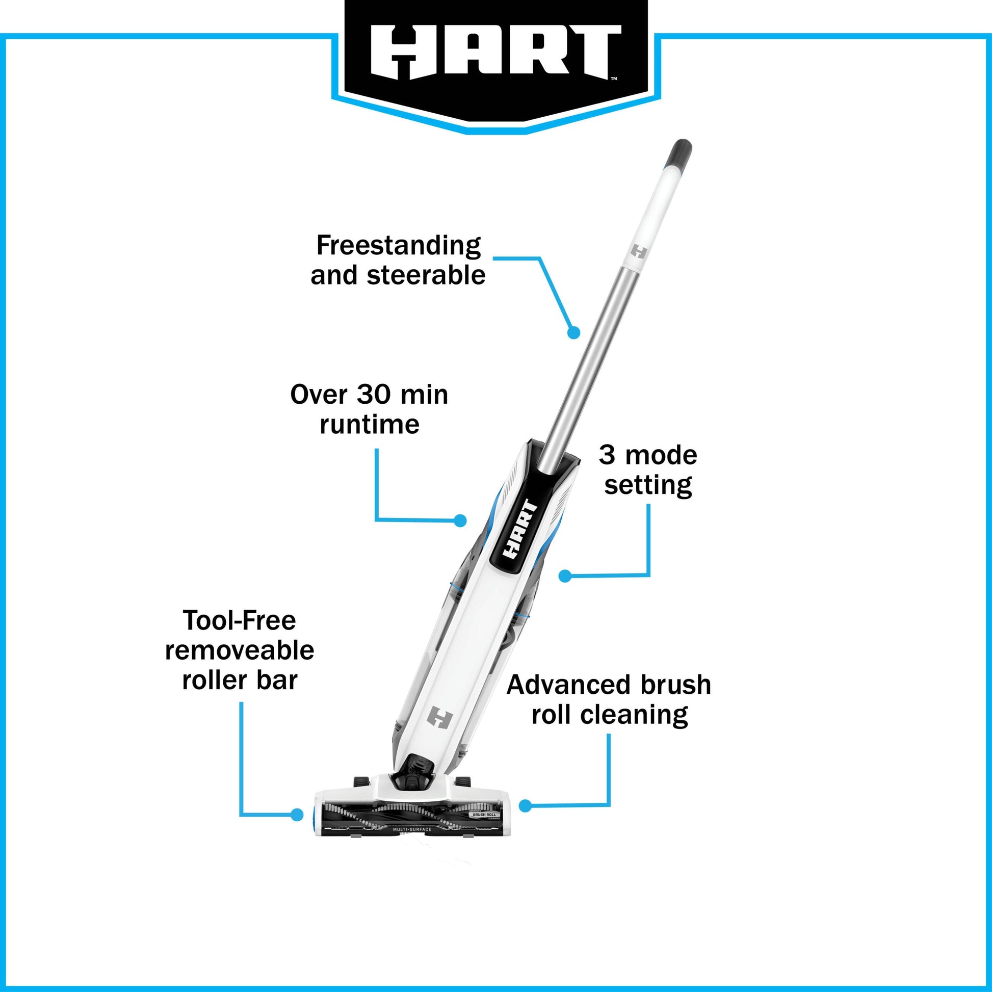 When it comes to weight and convenience. you can't beat the HART High Capacity Cordless Stick Vacuum. A mix between a stick and an upright vacuum. this combines the benefits of a lightweight. cordless stick vac. with the free-standing design and XL capacity of an upright vacuum. It has 3 mode settings to easily transition between multiple floor surfaces. With an XL dirt cup. you can spend more time cleaning and less time emptying. Additionally. this model includes a tool-free removable roller bar making maintenance simple. The steerable design allows you to easily maneuver around objects and furniture. Plus. it's free-standing. so it's convenient to store. This stick vac is also battery powered. so you can move freely from room to room without the hassle of a cord. In addition to the vacuum. filter and operator's manual. All HART 20V Batteries work with all HART 20V tools.