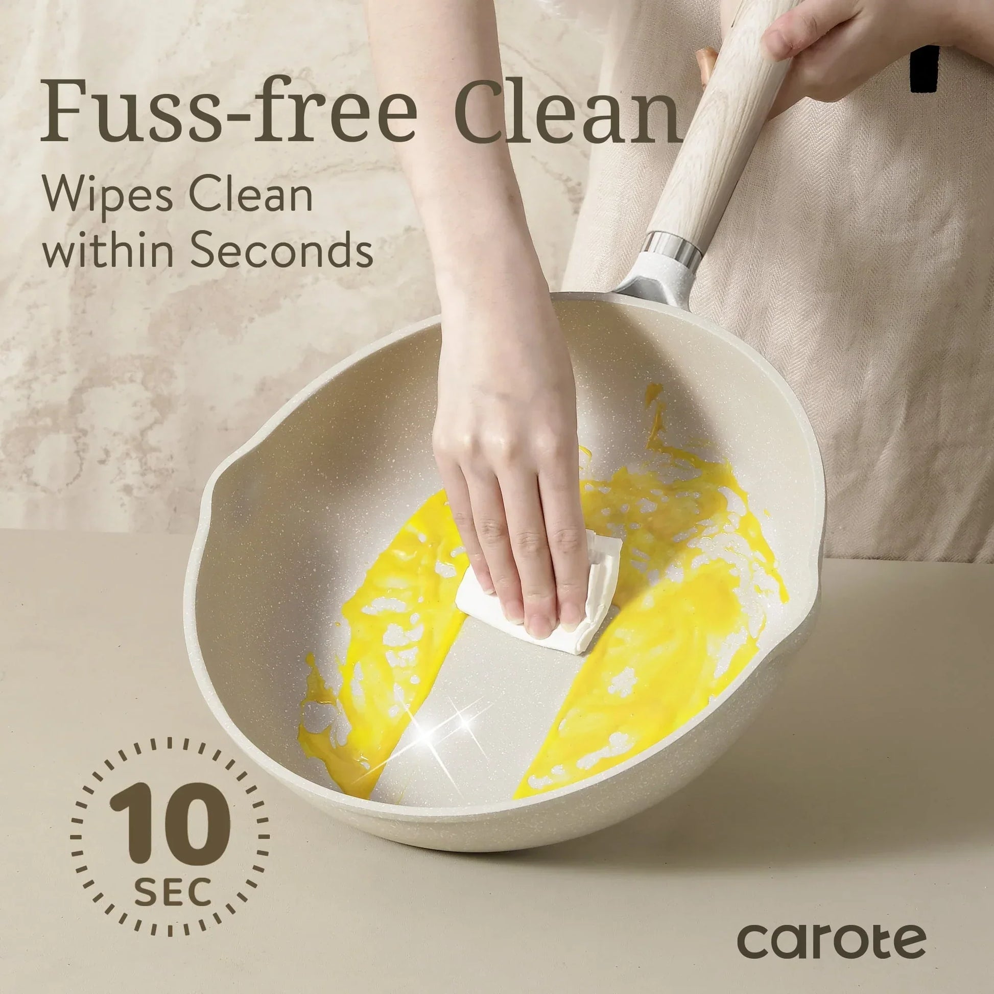- Excellent Non Stick Performance- Made from granite materials. our cookware inside texture is smooth. releases food effortless and ensures excellent non stick performance. Cooking with low consistent heat is the key to success for long-lasting nonstick.