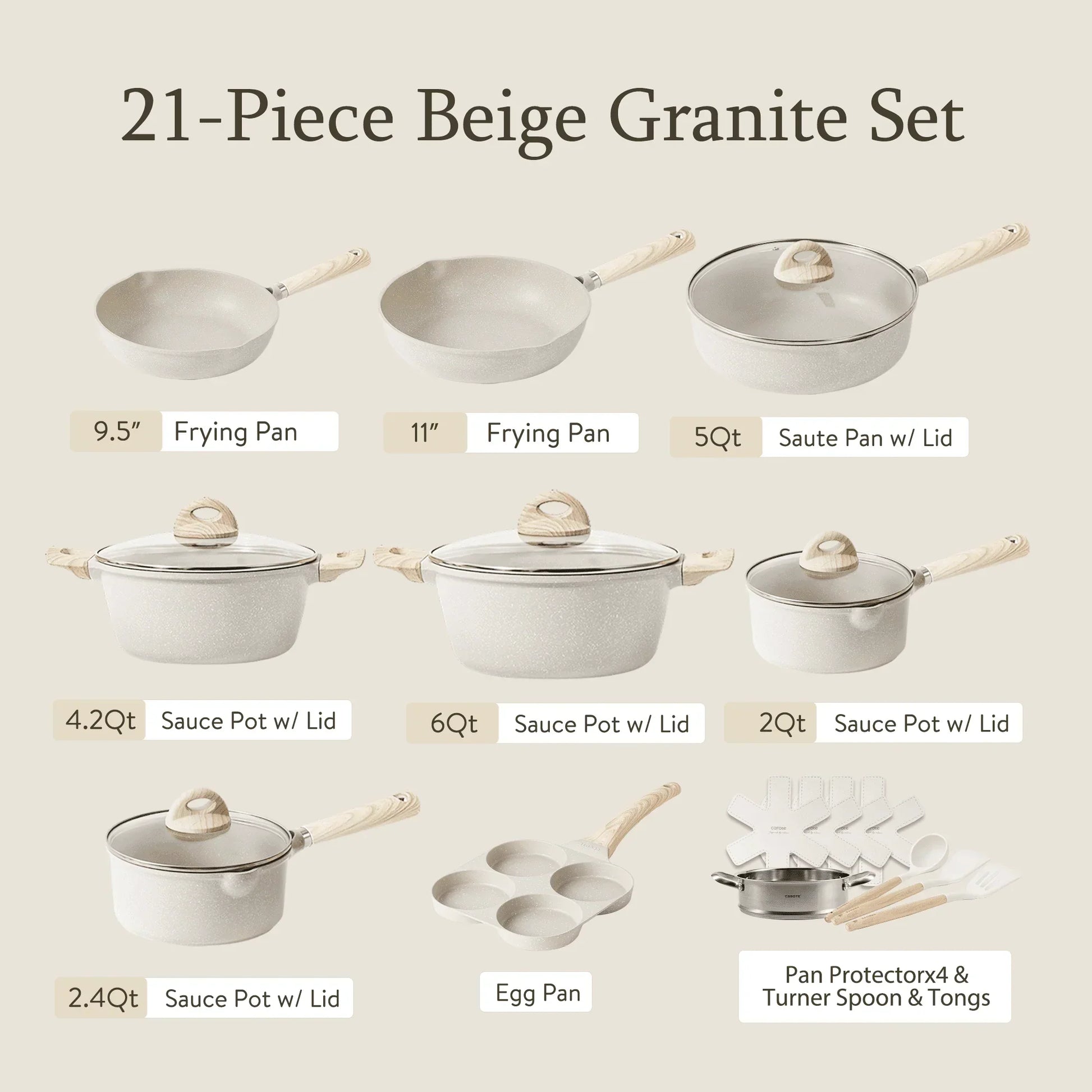 Non Stick Pots and Pans Set, 21 Pcs Induction Kitchen Cookware Sets (Beige Granite)