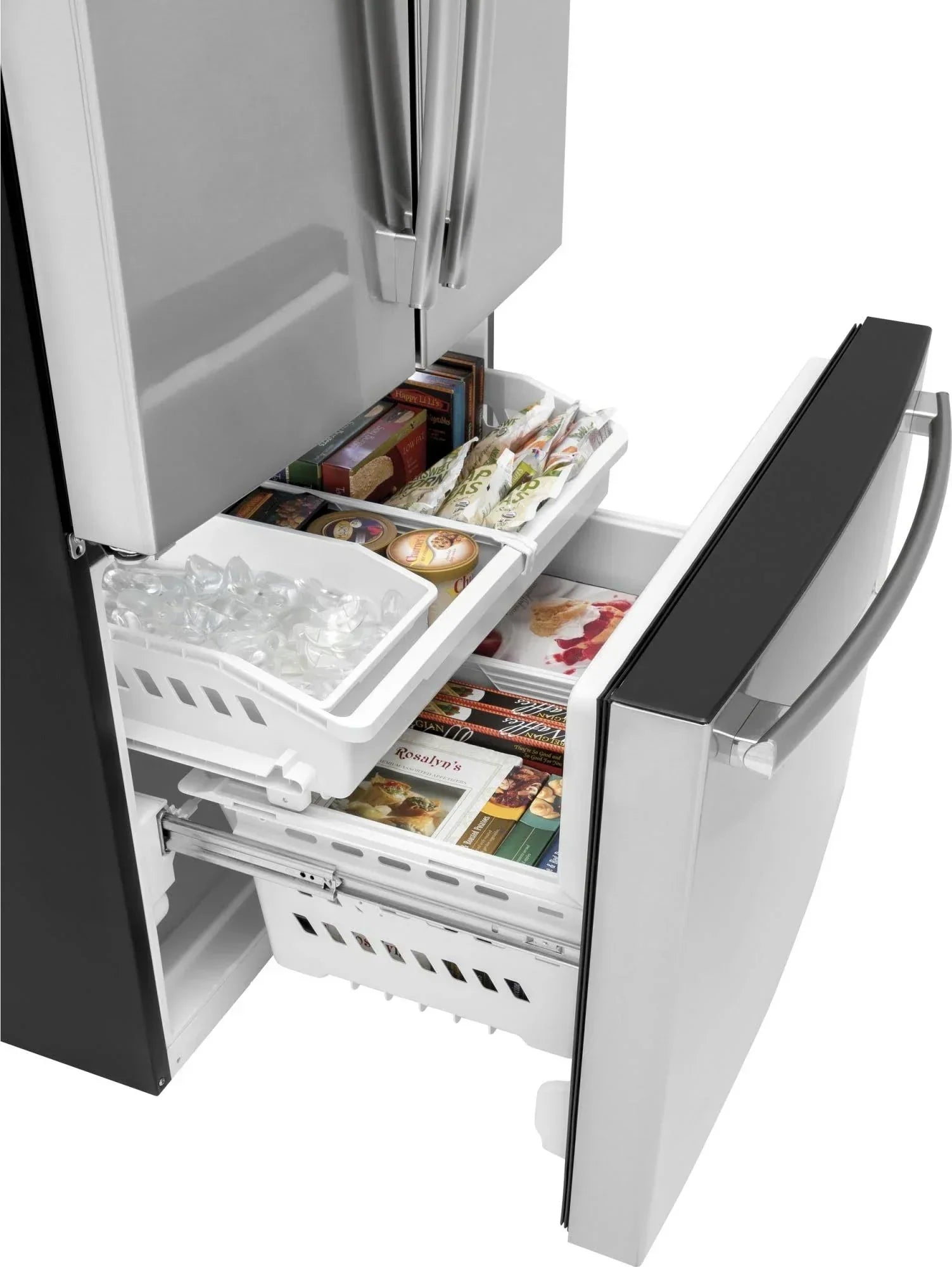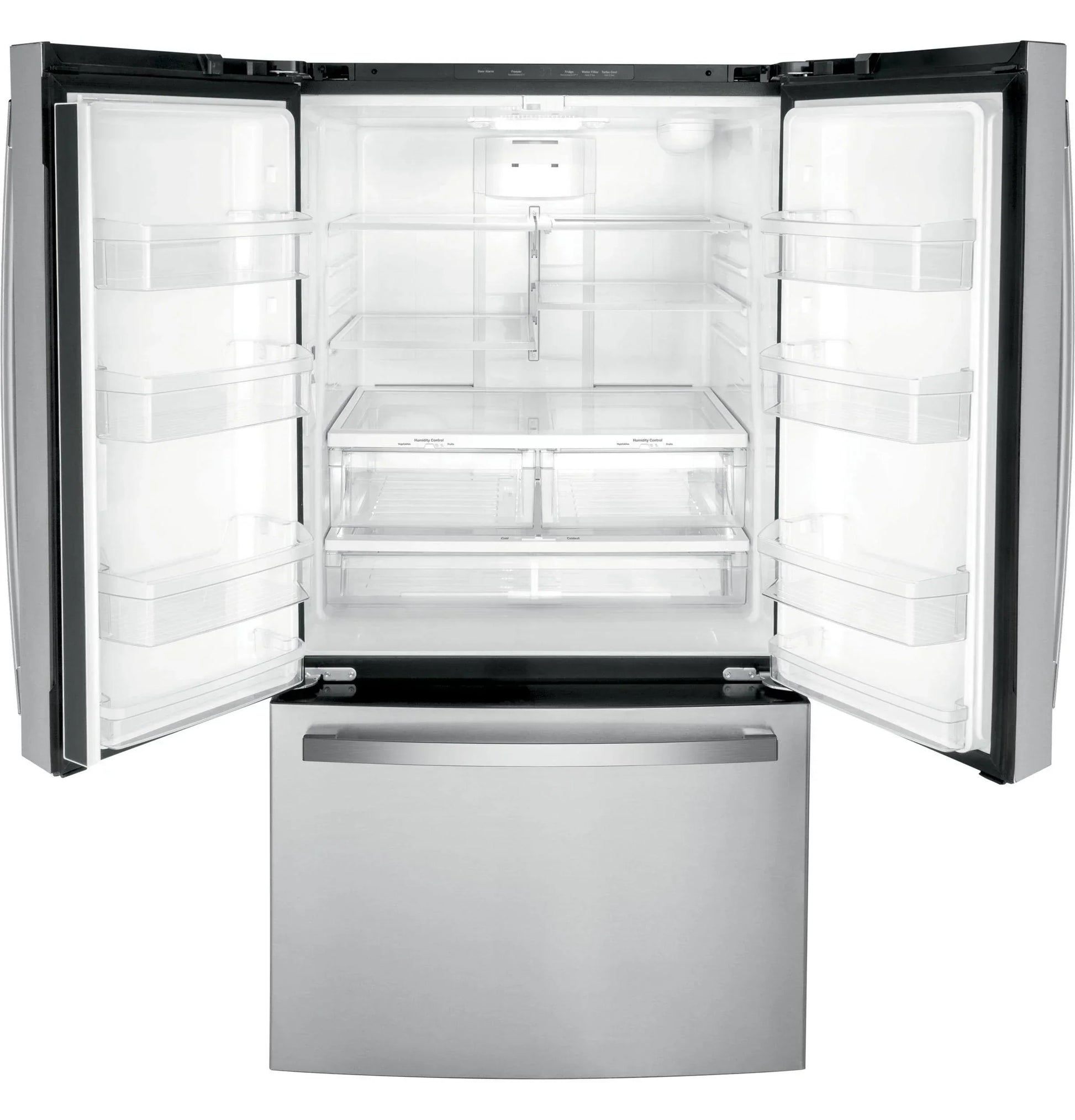 The Product ID: gne27jymfs is a GE French-door refrigerator with a capacity of 27.0 cu. ft. providing ample room for large or bulk food items. Superb features include an internal water dispenser providing filtered water with just a touch. two humidity-controlled drawers and a full-width drawer to keep fruits and vegetables fresh. and two-level freezer storage baskets for easy access to your frozen foods. This GE appliance is fitted with LED lighting that ensures you find your items quickly and easily. Its factory-installed icemaker is ready to provide filtered ice on demand. The refrigerator is equipped with advanced water filtration that significantly reduces trace pharmaceuticals from water and ice. ensuring healthy hydration for your family. Enhancing its practicability. the fridge includes spill-proof shelves. and a Quick Space shelf that slides out of the way for storage of tall items. The door houses deep bins for large containers. freeing up valuable shelf space. Stress-free maintenance and improved aesthetics are guaranteed with a fingerprint-resistant stainless steel exterior. You'll enjoy peace of mind with the door alarm feature. notifying you if the refrigerator door is left open. This GE refrigerator provides up-to-date technology and exceptional quality that simplifies your life. Its sleek and timeless design makes it ideal for your family.