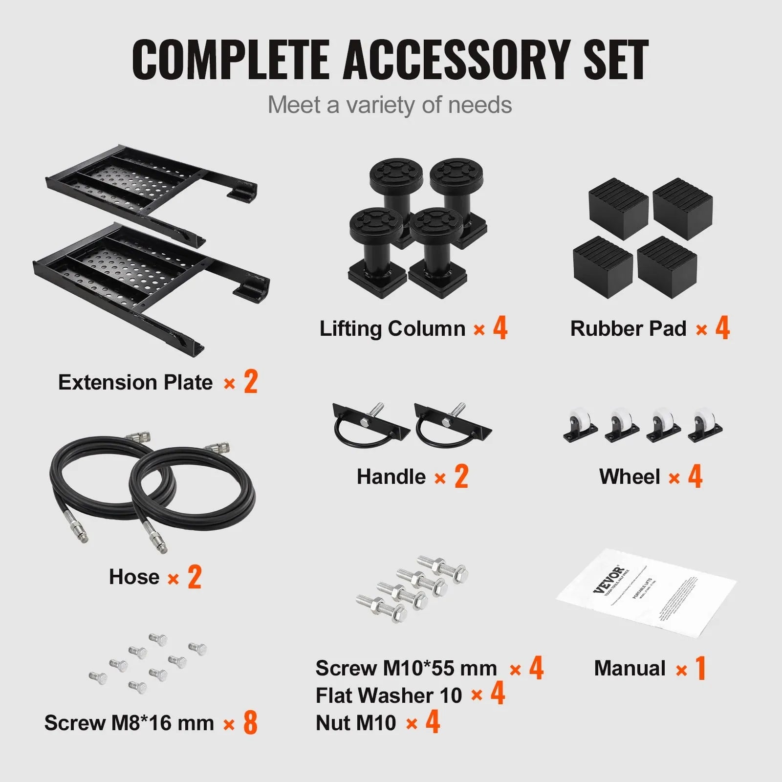 Comes with an array of essential accessories. including rubber pads. lifting columns. extension plates. handles. wheels. and more. ensuring a hassle-free lifting experience.