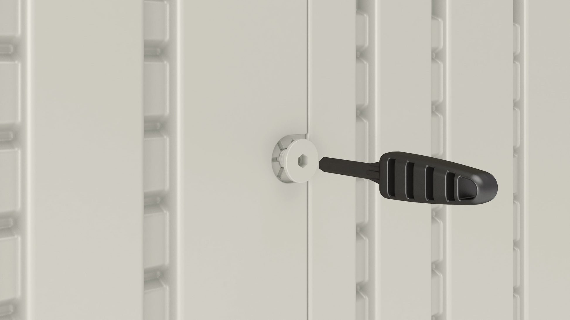 - Designed with metal-reinforced shingle-style roof panels with six skylights for natural lighting inside the shed